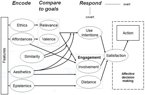 The I-PEFiC model [46] aligns with various interactive process theories, such as the Technology Acceptance and Affordance theory [90,91]. I-PEFiC is a model of human–character interaction that has three phases: encoding, comparison, and response. The I-PEFiC model integrates two main processes that are evoked during an encounter with a game character: the engagement process and the interaction process (Figure 2).