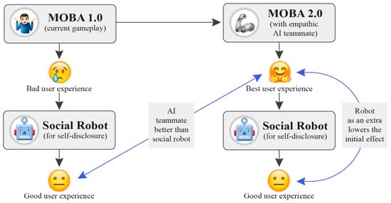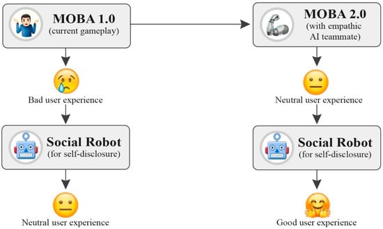 Even though the level of self-disclosure can vary depending on factors such as perceived trustworthiness, the context of the interaction, and the type of information being disclosed, individuals are generally willing to disclose personal information to social robots, particularly when the robot is designed to provide social support or companionship [89]. Social robots have been shown to invite self-disclosure of negative mood better than other media [42,43] and fit the environment of digital gaming, AI characters, and Virtual Reality. Therefore, we believe that social robots employed after gaming can facilitate self-disclosure without affecting other players’ real physical space. Offline robots can provide a channel for players to disclose and express themselves without introducing new negative stimuli to the game. In view of the potential of social robots to improve mood and build up a rapport, we will compare the application of a social robot after playing a standard human teammate version of a MOBA game (i.e., MOBA 1.0) to the application of a robot after playing a helpful AI teammate version (i.e., MOBA 2.0) in terms of the performance of self-disclosure of players.
