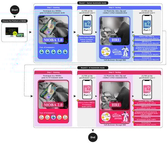 Teams that build up friendships among the members are more effective [86]. This means that players should reduce the emotional distance between their human and artificial teammates or, even better, increase their involvement with them. Self-disclosure is a fundamental component of human communication, sharing personal information with others and bridging communication gaps [87]. Self-disclosure often involves revealing personal information, life experiences, emotions, opinions, and thoughts. Engaging in self-disclosure with social robots can improve an individual’s cognitive understanding of personal attributes, increase self-efficacy, strengthen social connections, reduce biases, and promote psychological recovery and relief [46,88].