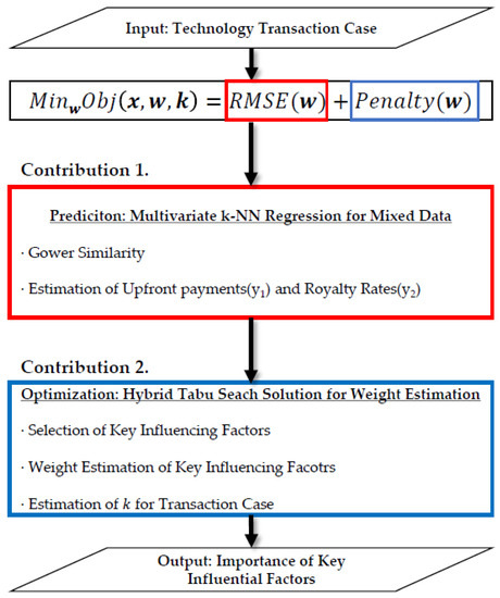 Therefore, in this study, we propose a method for predicting multivariate technology value, such as upfront payment and running royalty rate, and for evaluating the relative importance of influential factors to the multivariate response variables. To achieve this, we applied Gower’s similarity [7], which is suitable for mixed-type data, as shown in Figure 2, and used MkNN regression models to explain the relationship between influential factors and technical fees, including upfront payments and royalty rates. We used Tabu Search encoding solutions and a genetic algorithm to select influential factors that affect technical fees and simultaneously derive their weights and transaction case k. The contribution of this study can be summarized as follows.