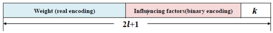 In this experiment, the chromosomes used were composed of an encoding solution for the hybrid tabu search algorithm; as shown in Figure 3, the total length of the chromosome was twice the initial number of key influential factors plus one . First, to select key influential factors, a binary encoding method was used with a total of bits of 0 or 1 in the chromosome ( to ). Each bit of the binary-encoded chromosome with a value of one represents a selected key influential factor, whereas a value of zero represents an unselected factor. Second, a real encoding method was used for the key influential factor weights in the chromosome ( to ), which contained a column of real values ranging from 1.0 to 10.0. The total real values represent the weight of each corresponding variable, with only the weights of the selected variables used in the variable selection chromosome. Third, for the part of the chromosome used to determine the optimal value, values of 3, 5, 7, 9, and 11 were selected. In classification problems, any odd number can be selected as a possible value; however, because this study deals with multivariate regression problems and proposes a new methodology, a value less than or equal to 11 was used. However, the range of values can be adjusted as required.