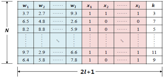 A binary integer representing the initial number of influential factors () was generated using a random number generator. Similarly, random numbers are generated in the range of 1.0 to 10.0 to create initial weights for each influential factor. The initial value for transaction case is set using random initialization. This process was repeated times to generate the initial population composed of solutions. The generated initial solutions are structured as shown in Figure 4.