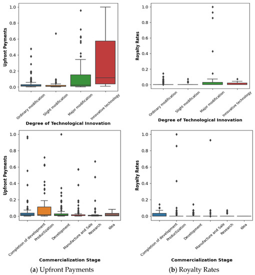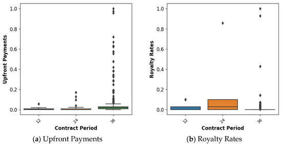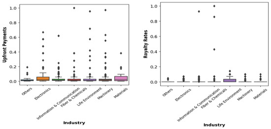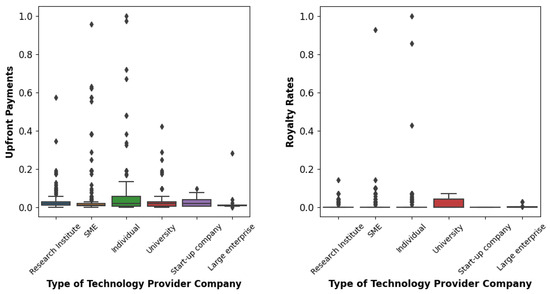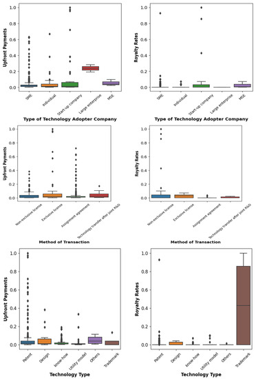 Similarly, concerning royalty rates, the ‘Trademark’ technology type exhibited a pronounced distribution. This phenomenon can be attributed to the inherent nature of ‘Trademark’ technologies, which frequently involve the payment of a fraction of ongoing sales as royalties. The comprehensive analysis presented above adds further depth to the insights gleaned from Table 3.