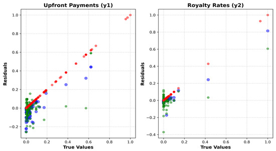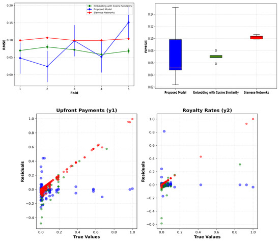 In the first line graph of Figure 7, the X-axis corresponds to each fold in a five-fold cross-validation, while the Y-axis represents the RMSE performance indicators for each model. Through this visualization, we can discern performance differences and consistencies among the three models. The Boxplot graph allows us to examine the distribution of performance levels among the models. The final graph displays the residuals between predicted and actual technology royalties for each model. For both ‘upfront payments’ and ‘royalty rates’, as the residual graphs for each model scatter randomly within a specific range, we can consider the predictive accuracy of the models to be relatively higher. Table 5 quantitatively summarizes these findings.