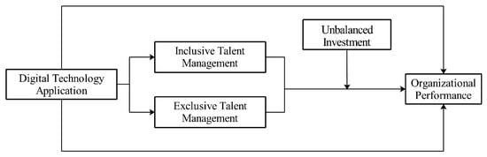 The application of digital technologies has a significant impact on organizational performance by way of different talent management methods, thereby enabling the maintenance of the organization’s continuous competitive advantage. Therefore, this paper studied the four key factors that influence organizational performance: digital technology application (DTA), inclusive talent management (ITM), exclusive talent management (ETM), and non-equilibrium investment (NET), aiming to investigate how digital technology application and talent management methods positively affect organizational performance, explore how this relationship is regulated by NET, and provides suggestions for selecting appropriate talent management methods. To conduct quantitative analysis, questionnaires were used with a sample size of 534 middle and senior managers as well as human resources practitioners from different enterprises. The structural equation model (SEM) was employed along with 5000 iterations to test the research hypotheses. The results indicate a positive correlation between digital technology application and organizational performance. Furthermore, ITM and ETM act as intermediaries between digital technology application and organizational performance, whereas NET plays a regulatory role in relation to ITM and organizational performance. This paper offers comprehensive insights into the factors influencing organizational performance and sheds light on how organizations make decisions regarding data-driven talent management methods at different stages of development.