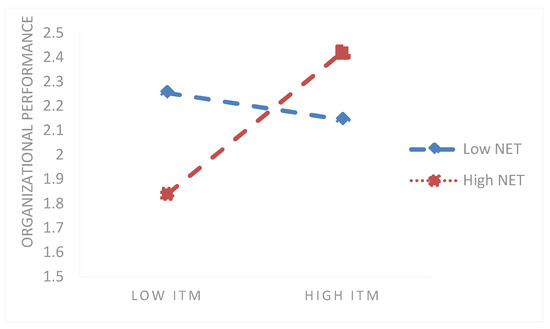 Based on M7, the variable of NET is included in the model to create M8. The interaction between ITM and NET is found to be significant (β = 0.170, p < 0.001), indicating that NET has a positive moderating effect on the relationship between ITM and organizational performance. To further analyze this relationship, we conducted a simple estimation using the average value of NET as well as one standard deviation above and below it as adjustment variables. Table 9 shows that under high levels of NET, the impact coefficient is 0.345 (p < 0.001), whereas under low levels of NET, it is 0.133 (p < 0.001). These results demonstrate that the adjustment effect of NET is significant.