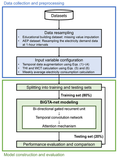 The training dataset for the BiGTA-net model was constructed by utilizing hourly electrical consumption data from 1 to 7 March 2015, for the educational building dataset, and from 11 to 17 January 2016, for the AEP dataset. In the case of the educational building dataset, the data spanning from 8 March 2015, to 28 February 2019, was allocated for training, while the subsequent period, 1 March 2019, to 29 February 2020, was designated as the testing set. For the AEP dataset, data ranging from 18 January to 30 April 2016, was employed for training purposes, with the timeframe between 1 and 27 May 2016, reserved for testing. The dataset was partitioned into training (in-sample) and testing (out-of-sample) subsets, maintaining an 80:20 ratio. Prior to the division, min–max scaling was applied to the training data, standardizing the raw electricity consumption values within a specific range. This scaling transformation was subsequently extended to the testing data, ensuring uniformity in the range of both training and testing datasets. This process ensured that the original data scale did not influence the model’s performance.