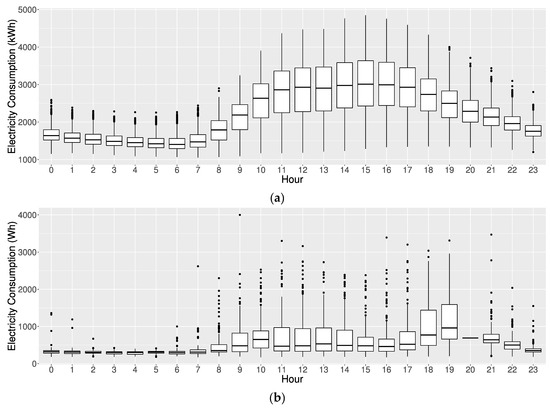 Boxplots for hourly electricity consumption by hours. (a) Educational building dataset; (b) Appliances Energy Prediction dataset.