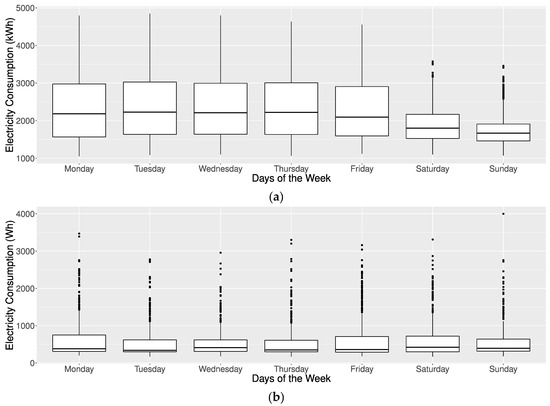 Boxplots for hourly electricity consumption by days of the week. (a) Educational building dataset; (b) Appliances Energy Prediction dataset.