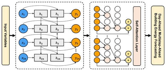 The modeling journey commences with the Bi-GRU, an advancement over traditional RNNs designed to excel in processing sequential time-series data. While conventional RNNs are recognized for their capability to recall historical sequences, they have encountered challenges such as gradient vanishing and exploding. To address these challenges, the GRU was introduced, incorporating specialized gating mechanisms to effectively manage long-term data dependencies [42]. Within the architecture, two distinct GRUs—forward and backward GRUs—are integrated to compose the Bi-GRU, enabling a comprehensive analysis of sequence dynamics [43]. Despite its computationally demanding dual-structured design, this two-pronged approach empowers the model to discern intricate temporal patterns. For an in-depth comprehension of the mathematical intricacies underpinning the Bi-GRU’s design, readers are referred to the extensive elaboration in the Keras official documentation [44].