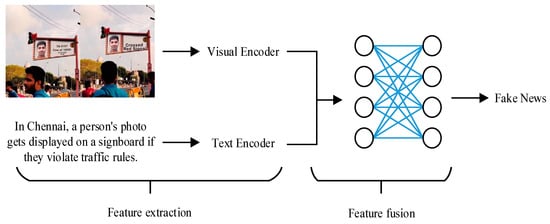 The main idea of the multimodal method is to train features from different modalities and then fuse them. Some fake news detection methods have been integrated into methods based on cross-modal comparative learning. For example, Qi et al. [40] mapped the pictures in fake news to the frequency and pixel domains and then fused the visual information in the two domains through a multi-domain visual neural network. Singhal et al. [41] obtained text features and visual features through pre-training models and fused them into new feature representations. Their simple, unified framework is shown in Figure 3 (the fake news image in Figure 3 comes from the network).