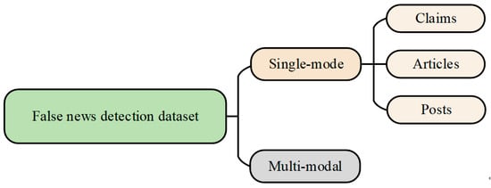 In the detection of fake news, the dataset used can be divided into single-modal and multi-modal data, as shown in Figure 5. We gathered prevalent fake news datasets from the past five years based on citations. Multimodal data has a more diverse form, typically comprising a combination of images or video text, as demonstrated in Table 3. Abbreviations for technical terms are defined upon first use. In contrast, unimodal datasets exclusively comprise text, providing a more extensive characterization. According to the dataset-construction method, data characteristics and adaptation tasks, it can be divided into three categories: