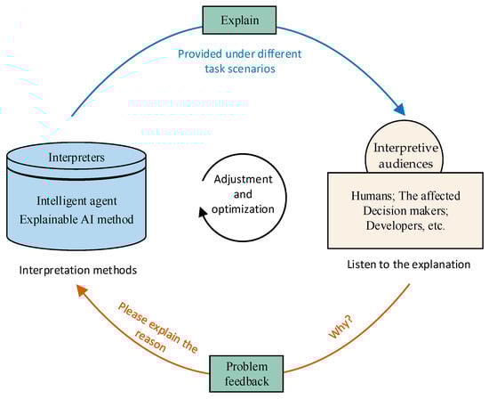 Figure 6 shows an interactive, explainable AI framework for human–machine communication. The main participants in the system are interpreters and interpretive audiences. Interpreters refer to artificial intelligence agents with many explainable AI methods that can make decisions based on specified tasks; the audience listens to the explanations given by the interpreters, who are generally the affected people involved in a task as well as decision makers and developers. The interpreter provides different forms of interpretation results to the interpretation audience according to different task scenarios; the interpreter, in turn, asks the interpreter questions so that the interpreter can make adjustments and optimizations. In this way, the interpreter will be more intelligent and put forward more convincing interpretation results.