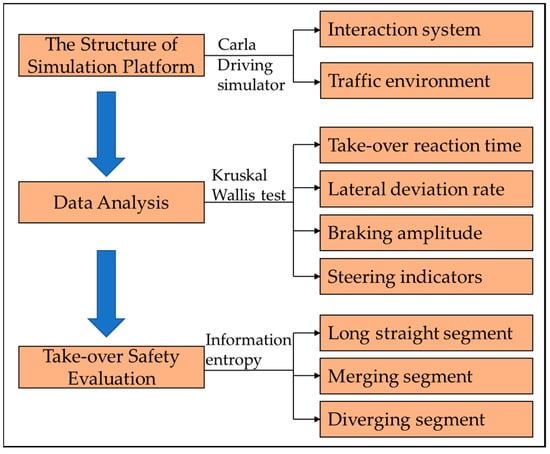 In summary, previous studies have examined some influencing factors that determine take-over performance. Nevertheless, driving performance for drivers with different urgency under a typical segment of highway during conditional automated driving has not been well investigated. The purpose of this study was to analyze the impact of time budget and traffic density on the drivers’ take-over safety. This study created different urgency by varying the traffic density (high density and low density) and time budget (5 s and 7 s) in each scenario. A long straight segment, a merging segment and a diverging segment were selected as three typical segments on the highway. Five evaluation indicators were used to evaluate take-over safety. The entropy method was used to determine the weights of different take-over behavior indicators to visualize the take-over safety in each scenario. The results of the study provide guidance for the analysis of take-over behavior and provide a theoretical basis for the optimization of human–machine interaction systems. The research framework is shown in Figure 1.