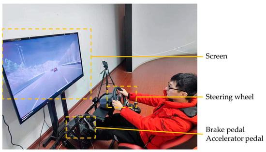 The take-over simulation experiment platform consisted of a driving simulator and simulated scenarios (built in Carla 0.9.13). The driving simulator mainly included a Logitech G29 steering wheel, a brake pedal, an accelerator pedal, a high-performance computer and a screen. The scenario was supported by Carla 0.9.13, which included automated driving simulation, traffic scenario construction, traffic flow generation, and other functions. Designers can freely configure the traffic rules and vehicle behavior in the simulation environment to simulate more risky driving scenarios. The take-over simulation experiment platform is shown in Figure 2.