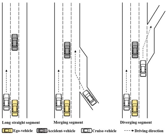 The experiment scenarios consisted of three typical segments: a long straight segment, a merging segment and a diverging segment. An accident vehicle was set in each segment. The driver needed to take over the vehicle to avoid the accident vehicle under different sub-scenarios that combine various influence factors. The three typical scenarios are shown in Figure 3.