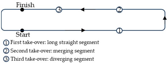 - Repeat the above process until the four take-over experiments was completed for one driver. The scenario layout diagram for one experiment is shown in Figure 4.