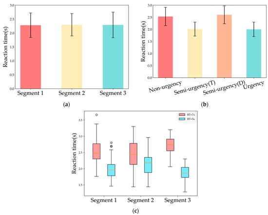 The experiment results of reaction time. (a) Reaction time under different typical segments; (b) Reaction time at different urgency levels; (c) Reaction time under three typical segments with different time budgets.