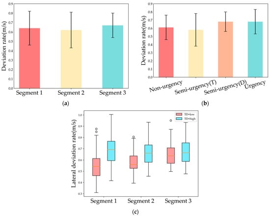 The experiment results of lateral deviation rat. (a) Lateral deviation rate under different typical segments; (b) Lateral deviation rate at different urgency levels; (c) Lateral deviation rate under three typical segments with different traffic densities.
