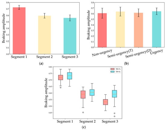 The experiment results of braking amplitude. (a) Braking amplitude under different typical segments; (b) Braking amplitude at different urgency levels; (c) Braking amplitude under three typical segments with different time budgets.