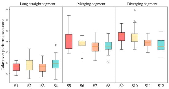 In Figure 5a, in general, there is no significant difference in the take-over reaction time for the three typical segments. There is almost no difference in the mean value of the driver’s reaction time (Segment 1 = 2.280 s, Segment 2 = 2.296 s, Segment 3 = 2.289 s).