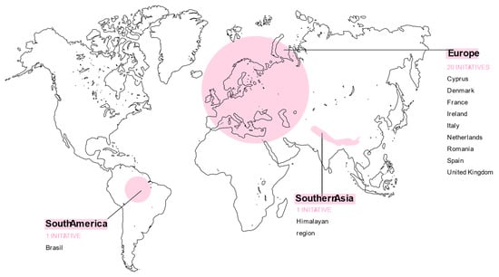 Methodologically, a desk research phase was followed by a case study methodology to restrict a broad scope of research into easily searchable areas. According to Yin [20], this method is particularly suitable for analyzing existing knowledge on a specific topic because it deals with research complexities by transforming the specific case into an operational component that can be explored in its original context, thus incorporating multiple elements and characteristics. Furthermore, Johansson [21] illustrated how the case study approach is appropriate for bridging the gap between quantitative and qualitative methodologies by an inductive theory-building generalization mode. Because the use of quadruple helix models is currently a topic of limited research [22,23,24], the case study technique provides concrete information that, while not generalizable, enables the establishment of understanding through the selected case studies [25]. The processed data are collected from the knowledge repository of the Fashion in Process Research Lab at Politecnico di Milano. The data stem specifically from the authors’ participation in three international field studies involving a consortium of European academic and research institutions [26,27,28] and the results of one of the authors’ doctoral studies [29]. The initial phase of the research dealt with mapping how European fashion companies engage in circular intersectoral initiatives, allowing strategic actions to be developed to promote an expanded awareness of what virgin material is and encourage a reassessment of the concept of new. This paradigmatic change is fostered by the multi-disciplinary networks nurturing interaction and collaboration from the different perspectives of all the quadruple helix actors. This first phase of mapping identified 23 initiatives, of which 20 are located in 9 nations on the European continent, 1 intercontinental that is being developed between Italy and the Hymalaini territories, and 1 located in Brazil (Figure 1).