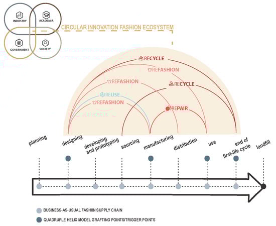 Based on what has been described so far, this paper presents a conceptual framework for understanding the micro- and macro-dynamics of open innovation in the field of sustainable fashion using a quadruple helix model. This is accomplished by identifying and systematizing four design-driven actions: reuse, repair, refashioning, and recycling. to eliminate the concept of waste to support local ecosystems and the development of a closed-loop fashion supply chain that hacks existing systems by bending the line of business as usual. Companies can act strategically upstream in the supply chain, in the design phase, or downstream, in the waste management phase, to create a cascading effect on all subsequent phases (Figure 2).