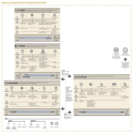 In conclusion, ecosystem innovation is a space to solve contemporary challenges, such as tackling climate change and other global challenges, such as biodiversity loss, pollution, and waste, by bringing together various stakeholders for collaboration and collective ideation [15]. Such systems could feed effective circular practices, in the fashion sector, through the creation of joint initiatives that, through design-driven actions—reuse, repair, reuse, and recycle—involve the different actors, in their separate ways, to eliminate the concept of waste to support local ecosystems toward creating a closed-loop chain to achieve the ultimate goal of the circular economy by decoupling economic activity from the consumption of finite resources [65].