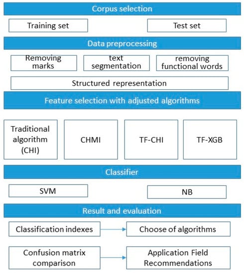 Furthermore, with the increasing networking of Chinese social life, Chinese text classification needs to deal with an increasingly large amount of text data. Different text types have different features, and feature selection methods must also be distinguished. Including multiple algorithms for different needs has become increasingly important [9,10]. However, such studies could seldom be found by far and are urgently needed.