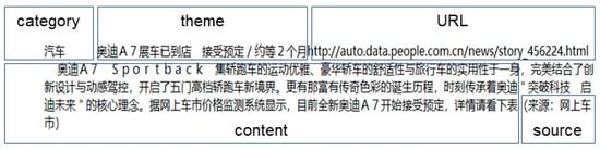 The purpose of the experimental design of this study is to verify the effectiveness of the proposed feature extraction method. Due to time and resource constraints, we chose a smaller-scale data set for the experiment. Download 500 pieces of text data under each category to form a data set with a size of 3000. There was no overfitting in the 3000 corpus during the experiment, which met the preliminary verification requirements. Each piece of news is saved in the data format of “category”, “theme”, “URL”, “content”, and “source”, as shown in Figure 2.