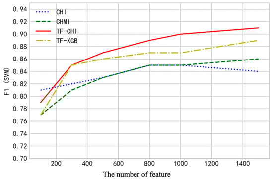 With the NB algorithm as the classifier, CHI, CHMI, TF–CHI, and TF–XGB are used as feature selection algorithms. Similar to the setting for the SVM classifier, the relationship between the text classification and the number of features is verified by setting the number of features to 100–1500. According to the classification result -score obtained at this time, the following figure is prepared: