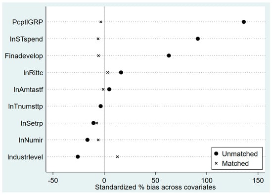 As an exogenous policy shock, the IP pilot cities have effectively tackled the issue of endogeneity. Nevertheless, it is crucial to acknowledge that the selection of pilot city areas might not have been random, leading to potential variations between different cities and universities. These variations could introduce some ‘noise’ to the policy evaluation results in this study. To address this concern, we utilize propensity score matching to identify a comparable control group for each experimental group. We then use the matched samples to estimate the logit model. We initially tested the matching equilibrium hypothesis, and the results are presented in Figure 2. The comparison between the density functions of treated and untreated cities before and after matching equilibrium reveals a significant overlap. However, it is important to note that there is a positive bias in the distribution of cities within the treated and untreated samples, particularly in terms of their level of economic development, financial development, and science and technology expenditures. Figure 3 illustrates the relative magnitude of the variable-specific bias, and the absolute value of the standardized percentage for all variables is less than 20 percent. This indicates that there were no systematic differences between the treated and control groups after matching, validating the results of the matching treatments.