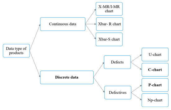 According to [29], statistical quality control (SQC) is the process of using statistical data from the processing of producing products to evaluate and control the quality of products in a production line. SQC focuses on practical statistical methods in quality control and improvement. Not only analyzing the continuous data for exploring the quality of products, SQC also examines the discrete data to investigate the defects or nonconformities in products. In a nutshell, using the SQC method is suitable for enhancing quality control in microfastener manufacturing. In this study, we propose a method combining deep learning approaches with control charts in SQC to detect defects and improve the quality of products. As shown in Figure 1, there are some different statistical models in the SQC for controlling the quality of products. Based on the characteristics, we selected the C-chart and P-chart for analyzing the defects occurring on the microfastener used in rechargeable batteries and hence improving product quality management.