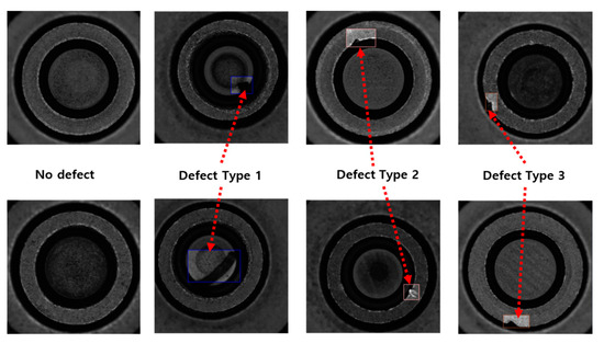 The dataset was provided from a real factory that supplies components for the production of batteries in Korea. It contained 1150 captured images of microfasteners used to produce rechargeable batteries. In the microfastener production process, there are three different types of defects that can appear on the surface of the product. The category of defects depends on the location of its appearance. Figure 2 describes the dataset collection method and the differences between defect type 1, type 2, and type 3.