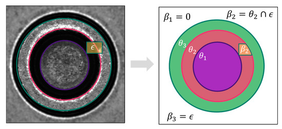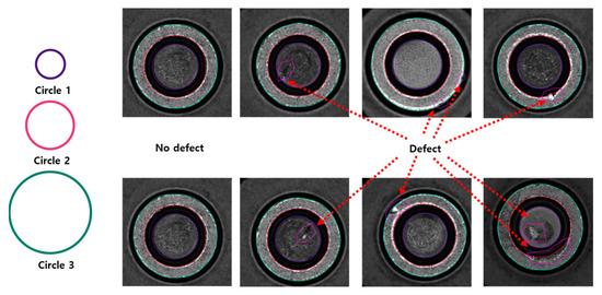 Method 2—Indirect: In this method, similar to method 1, the initial step involved annotating defects on the surfaces of products. However, instead of categorizing them directly as type 1, type 2, or type 3, they were uniformly labeled as “defect”. Subsequently, we annotated three circles (“circle 1”, “circle 2”, and “circle 3”) on the images, each representing specific regions corresponding to the bordering circles on the surfaces of the microfasteners (see Figure 4).