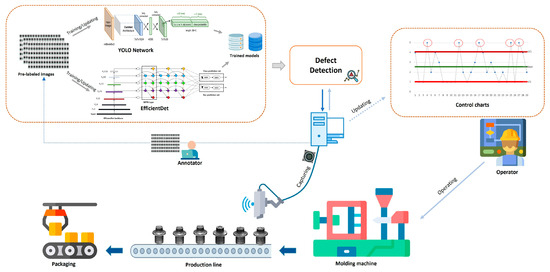 The operational principle of this architecture is as follows: In the traditional manufacturing process, the operators control the molding machine initially, producing microfasteners. Subsequently, defect-checking workers inspect and remove defective products from the production line before packaging. In the proposed architecture, we employ a camera positioned above to capture images of microfasteners. The defect detection module then utilizes pretrained models to identify defects in the product images. Information about defect types per product and per lot will be displayed in C-chart and P-chart formats. These charts provide operators with insights into the number of defects in each product and batch. If the defect count exceeds the allowable threshold ( is a value set by the operators to allow maximum defects on each lot), operators will adjust the production line and molding machine to fix the issues, thus enhancing the quality of subsequent product manufacturing.