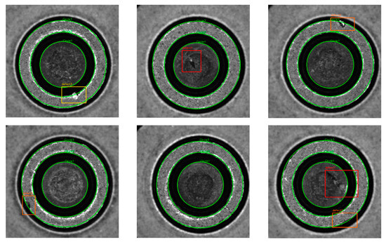 Results on Method 2: As explained in Section 4, the process of selecting the category for the detected defect involved calculating the overlap area between the defect’s bounding box and three circles, followed by a comparison with the acceptance rates (ε_1, ε_2, ε_3) to make the final decision. Figure 10 illustrates certain results obtained using YOLOv8 that had the highest accuracies with the acceptance rate values (0.6, 0.3, 0.1). For additional information on other results, please refer to the Repository section.