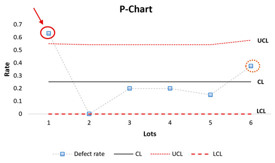 Analyzing the information provided by the P-chart reveals some useful instructions: It becomes evident that lot 1 exhibited a notable quantity of defective products, with a defect rate exceeding the threshold defined by the UCL line (highlighted by the red circle). Moreover, lot 6 represented a raised count of defective products beyond the CL (denoted by the yellow circle). This information is a valuable resource for the operator to control production lines efficiently, mitigating defects in the final products.