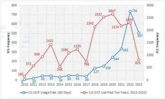 Overall, there was high and frequent use of SCPs on VRSIM in manufacturing, indicating an active research area. The 766 publications were used frequently (U1 = 2391 times; U2 = 19,343 times, respectively). The trend analysis for U1 shows a consistent increase in SCP use across all years, with recent publications used more often, meaning that recently published articles received higher usage counts than the older ones. For example, the 33 articles published in 2010 have been used just 8 times in the last six months and 160 times in the previous ten years (2013 to 2023). Comparatively, the publications in 2021 recorded an access count of 333 times, while the SCP in 2022 recorded a usage count of 735 times for U1, more than twice the number accessed in 2021. U2 also followed a similar trend (Figure 2), although the trend for U2 highlights more variation in use yearly, with more up/down movement, the most yearly variation occurring between 2013 and 2017.