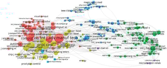 The co-citation analysis also reveals the intellectual structure of research and can be based on articles, authors, or sources. In this study, we employ the sources co-citation analysis as the unit of analysis []. The result addresses the second research objective (RO2), which examines the intellectual structure of VRSIM in manufacturing in the 4IR or i4.0, as stated earlier in Section 1.