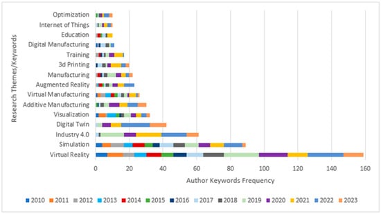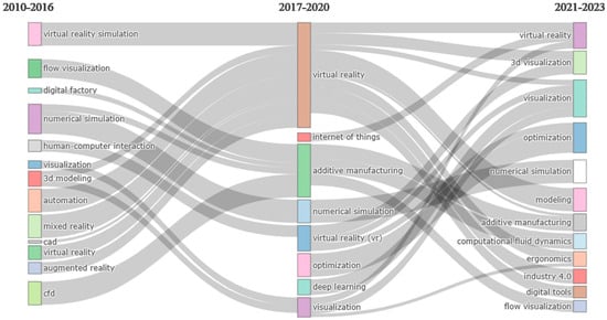 This section analyzes the evolution of the research themes on VRSIM in manufacturing in the 4IR era. The purpose is to identify the transformation in the research focus during the period. Undertaking text analytics of author keywords and science mapping using the R-Bibliometrix application highlights the trending themes. The results based on the default output strategies divide the period into three segments, namely 2010–2016, 2017–2020, and 2021–2023, covering the 4IR era (Figure 5). The focus is to evaluate the conceptual structure of the publications, which addresses the third research objective (RO3).