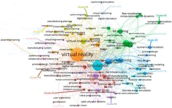 The themes mentioned in the fourth cluster of the conceptual structure analysis identify themes such as “virtual manufacturing”, “virtual factory”, “digital factory”, and “digital prototyping”, which relate to virtual manufacturing (VM) technology, where VRSIM also plays a significant role. VM uses computer-based models and simulations to design, simulate, and optimize the entire manufacturing system, often in a digital or virtual environment [,]. It entails the creation of digital models, including product design, production planning, scheduling, and optimization of manufacturing processes [].