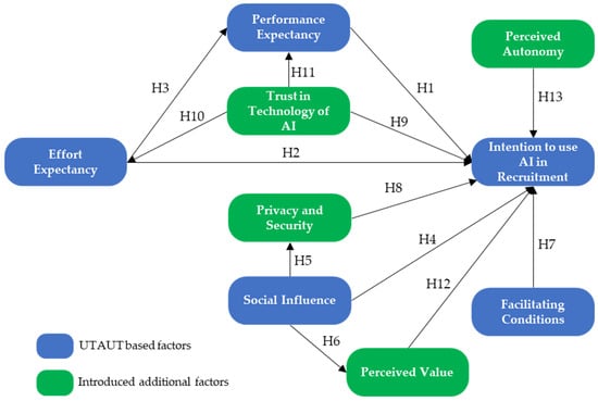 Autonomy is crucial for human well-being and growth, defined as the ability to make self-directed choices and govern oneself. According to self-determination theory, autonomy means choices initiated by one’s conscious self and informed decisions after evaluating options. A broader perspective on autonomy is vital for rebuilding trust in human–machine interactions []. AI autonomy is defined as the ability of AI technology to perform tasks that originate from human actions without the need for direct human involvement. In the research of intelligent personal assistants, AI autonomy is categorized as sensing, thoughts, and actions that have a direct impact on the perception of intelligent personal assistants that also directly influences the use intention []. Similarly, from other studies, perceived autonomy has been found to have a notable influence on the adoption of the IoT [] and the utilization of online courses []. Therefore, perceived autonomy positively affects the intention to use AI in the hiring process. The thirteenth hypothesis can be tested as follows: