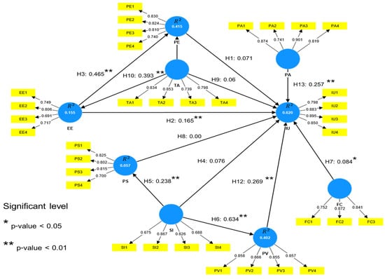 Furthermore, it is worth noting that trust was observed to directly impact both performance expectancy and effort expectancy, as evidenced by studies on the adoption of emerging technologies in various domains, including mobile payment [], information systems [], and e-document authority []. In a study regarding the expanded Technology Acceptance Model (TAM) [], it demonstrated that trust has a positive correlation with perceived usefulness. Consequently, it is relevant to assess these relationships, leading to the formulation of the tenth and eleventh hypotheses accordingly: