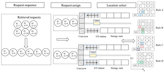 - Independent assignment policy: Managing multi-aisle AS/RSs independently means evenly allocating requests to cranes in the sorted order regardless of the rack states and the processing time of requests for each crane.