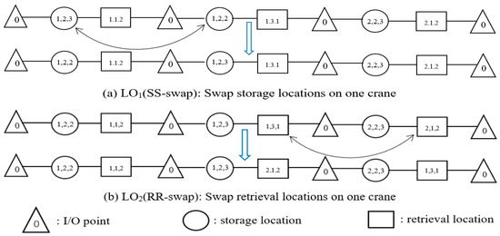 - Yang, P.; Miao, L.; Xue, Z.; Ye, B. Variable neighborhood search heuristic for storage location assignment and storage/retrieval scheduling under shared storage in multi-shuttle automated storage/retrieval systems. Transp. Res. Part E Logist. Transp. Rev. 2015, 79, 164–177. [Google Scholar] [CrossRef]
