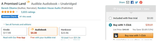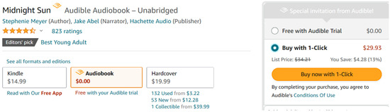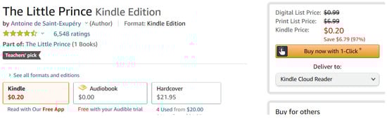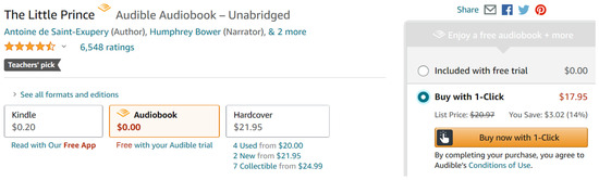 Publishers have to take into account the impact of audiobooks on e-books. In particular, now the e-books industry is mature, leaving an opportunity for audiobooks to balance publishers’ profit, many publishers are considering how to release a book in its audible version and its e-book version. From Amazon.com, we can find that there are some books where their two versions were simultaneously released. For example, for one of the bestsellers on Amazon.com, «Everything Is F*cked: A Book About Hope», its Kindle edition and audible edition were simultaneously released on 14 May 2019. The Kindle edition and audiobook of Michelle Obama’s book «Becoming» were simultaneously released on 13 November 2018. For the book «Fear: Trump in the White House» by Bob Woodward, which is also on Amazon’s bestsellers list, its Kindle edition and audible edition were simultaneously released on 11 September 2018. However, from Amazon.com, we can also find that some books with Kindle editions were released first and then their audible editions were released into the market. For example, the Kindle edition of the classic novel «Don Quixote» was released on 29 January 2009, then its audible book was released on 29 October 2012. For the French children’s book «The Little Prince», its Kindle edition was first released on 19 May 2018, then its audible version was released on 23 May 2020. In addition, from Amazon’s site, it can also be seen that nearly all audible versions of books on Amazon are more expensive than their Kindle editions; see the book example shown in Figure 1. Figure 1 illustrates an example of retail prices from a top-ranked bestseller in Audible Books & Originals on Amazon.com. The audible version of the book is sold at about USD 29.93, but the retail price of the Kindle edition is USD 14.99.