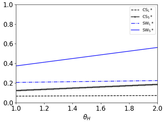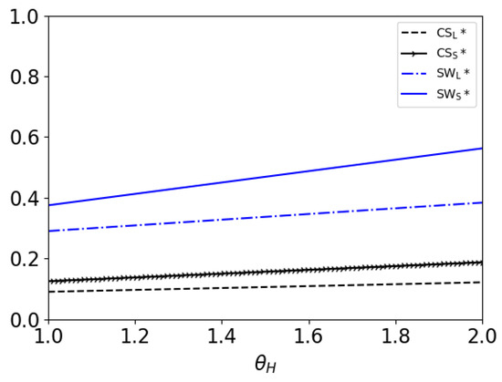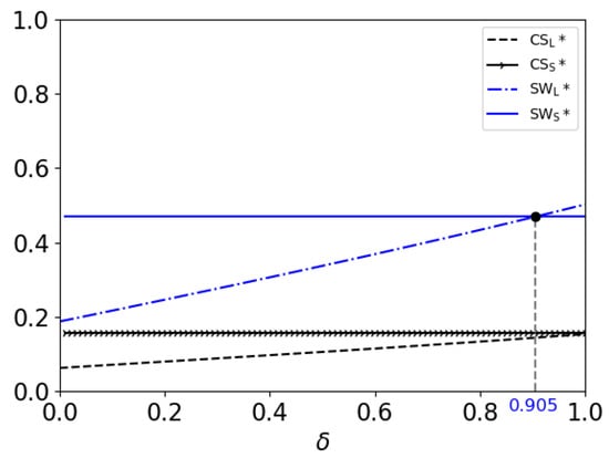 Given the values of and , as and , we test the effects of the discount factor on the consumer surplus and the social welfare. In the following figures, the subscripts L and S represent the lagged release model and the simultaneous release model, respectively.