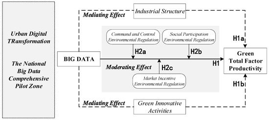 Big data exerts a significant influence on the GTFP. On the one hand, the data capital possesses a pervasive impact, capable of driving improvements in quality and efficiency across various industries and domains [24,25,27]. On the other hand, the implementation of big data can diminish energy consumption slightly and enhance environmental regulation efficiency [35,40,41]. Hence, the urban digital transformation based on big data technology tends to elevate the overall level of GTFP. The enhancement of urban GTFP by big data potentially occurs within two channels: firstly, promoting industrial structure upgrades on a macro level [51,52,53], and secondly, fostering green innovative activities at the micro scale [48,49]. Both the upgrade of industrial structure and green innovative activities have a significant impact on increasing the GTFP. Thus, we propose the following hypotheses H1, H1a, and H1b: