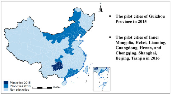 Chinese policy experimentation has evolved as an institutional arrangement, where local regions implement pilot projects before a new policy plan is proposed. The experiences from these pilot experiments are then extended to the whole country. China has conducted several policy experiments since reforming and opening up, such as special economic zone pilots, state-level new zone pilots, and free trade zone pilots, gaining valuable development and reform insights through early implementation and innovation. This study takes the construction of the NBDCPZ as a quasi-natural experiment. Regarded as an “experimental field” for big data practices in China, the NBDCPZ enables us to observe the impact and implications of big data strategies and applications under relatively controlled conditions. These “treatment” cities can be compared against other cities (control group) that have not received this same level of focus on big data development. By comparing the changes in GTFP before and after the establishment of the NBDCPZ, we can isolate its causal effect, similar to the methodology employed in a natural experiment. As shown in Figure 3, the policy experiment was implemented in two batches, with the Guizhou Big Data Comprehensive Pilot Zone was announced in 2015, and the second batch, including Beijing, Tianjin, Inner Mongolia, Hebei, Liaoning, Chongqing, Guangdong, Henan, and Shanghai, was announced in 2016. Then, we set the baseline regression model (difference-in-differences) as follows: